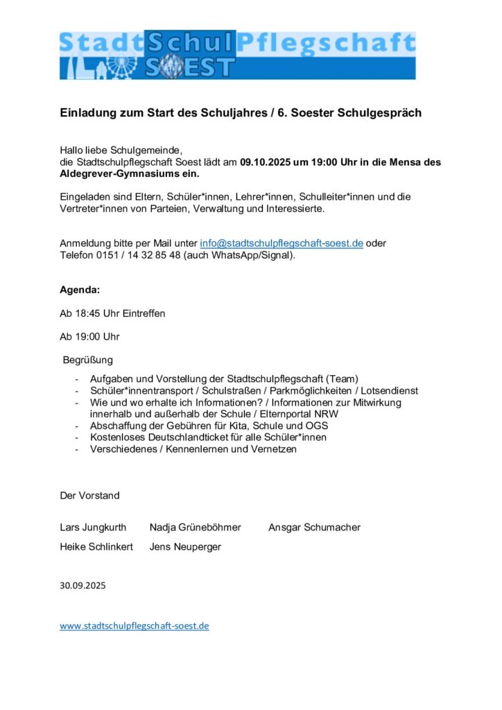 Einladung zum ersten Schulgespräch im neuen Schuljahr Beitrags-Autor:admin Beitrag veröffentlicht:30. September 2025 Beitrags-Kategorie:Informationen Das könnte dir auch gefallen Gründungsveranstaltung am 07. Januar 2021 !!! 6. Januar 2021 „Nur noch 5 Minuten!“ 31. Januar 2025 Rund um Schulmitwirkung – Online-Veranstaltung für Eltern 28. August 2024